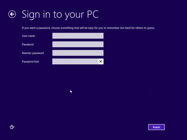 ** ในขั้นตอนนี้จะมีวิธีการ Sign in to your PC อยู่ 2 วิธี ได้แก่ Email Address และ Sign in without a Microsoft account สำหรับในที่นี้ผมขอให้เลือก Sign in without a Microsoft account เพราะสะดวกกว่า ส่วนEmail Address เราต้องต่ออินเตอร์เน็ตและต้องมีอีเมลของ outlook.com หรือ Hotmail.com อยู่ก่อนแล้ว ซึ่งเราสามารถสร้างได้ภายหลังที่เข้าใช้วินโดวส์แล้วก็ได้ **